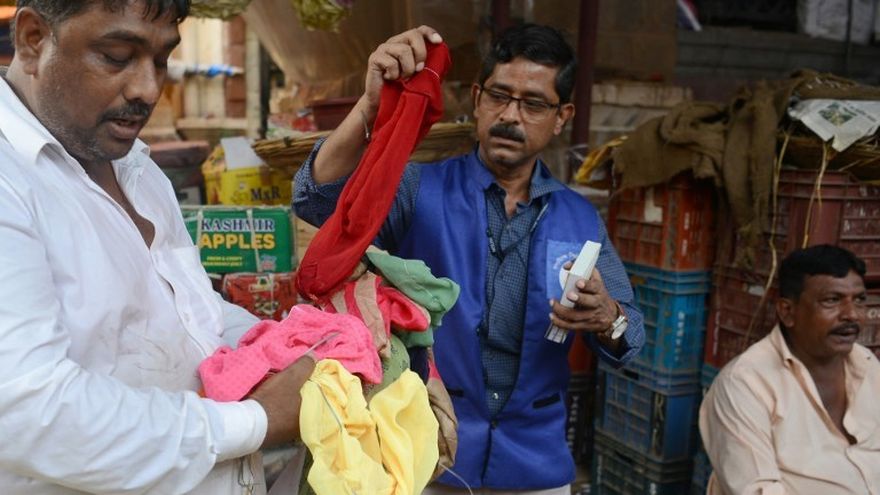 Vestidos con distintivos chalecos de color azul, una decena de inspectores municipales se reparten por el concurrido y pintoresco mercado de Crawford en Bombay en busca de infractores de una ambiciosa prohibición del plástico.