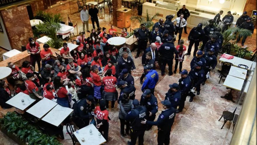 Varios centenares de activistas y simpatizantes de una organización judía estadounidense que apoya la causa palestina realizaron el jueves una manifestación relámpago en el interior de la Torre Trump, la residencia neoyorquina del presidente estadounidense, denunciando su ofensiva contra la libertad de expresión.