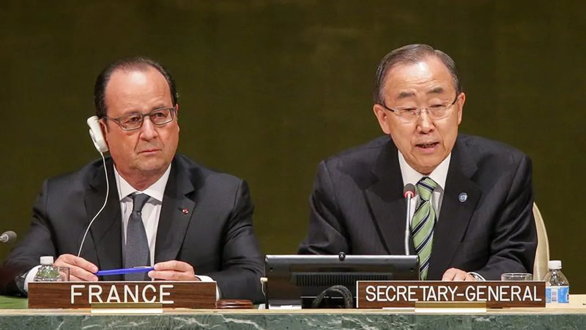 El presidente francés, François Hollande (i), y el secretario general de la ONU, Ban Ki-moon (d), durante la ceremonia inaugural de firma del Acuerdo de París en la sede de la Naciones Unidas de Nueva York (EE.UU.). / EFE