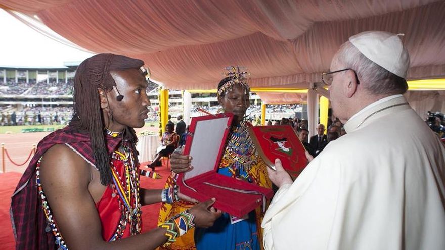 Incluso la presidenta de la transición, Catherine Samba-Panza, recibió al papa en la tribuna de autoridades con un alegre vestido en tonos azules y rojos en la que el principal motivo era una foto de Bergoglio.