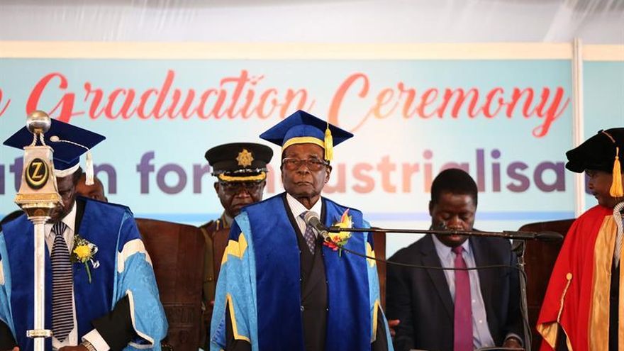 El jefe de Estado, de 93 años, vestía toga azul y tocado del mismo color, para esta recepción en la Universidad Abierta de Zimbabue.