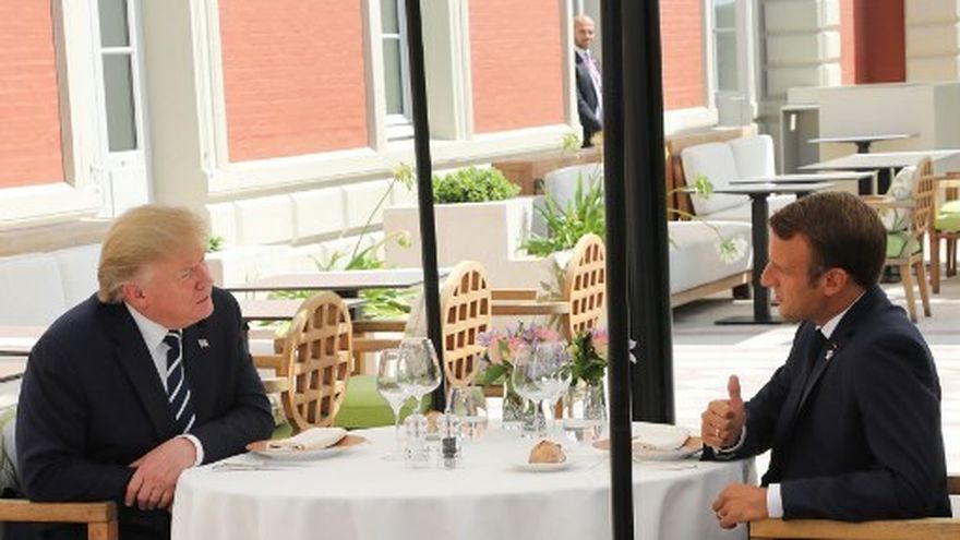 Según el Elíseo, el almuerzo fue "improvisado" y tuvo lugar en la terraza del Hôtel du Palais donde Macron y Trump se sentaron solos en una mesa, a una decena de metros de sus acompañantes en la cumbre, como el ministro de Relaciones Exteriores francés, Jean-Yves Le Drian, y el consejero de seguridad nacional de la Casa Blanca, John Bolton.