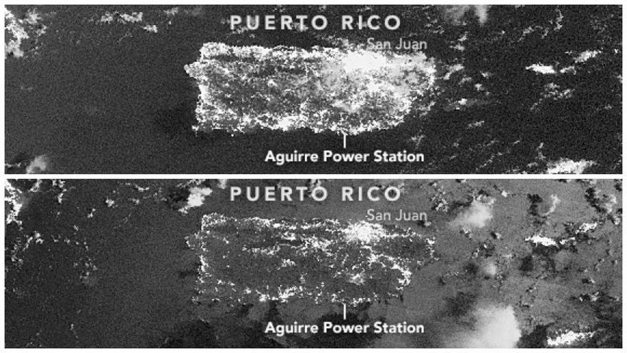La Administración Nacional Aeronáutica y del Espacio de Estados Unidos (NASA) ha distribuido sendas fotografías tomadas por un satélite en las que se observa claramente la diferencia de Puerto Rico antes y después del apagón masivo registrado ayer y que mantiene hoy parcialmente a oscuras a la isla.