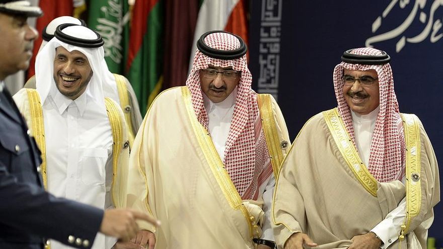 El ministro del Interior de Arabia Saudí, príncipe Mohamed bin Nayef (c), el ministro del Interior de Baréin, jeque Rashid bin Abdalá al Jalifa (d), y el primer ministro de Catar, jeque Abdulá bin Nasser bin Jalifa al Zani (i). / EFE