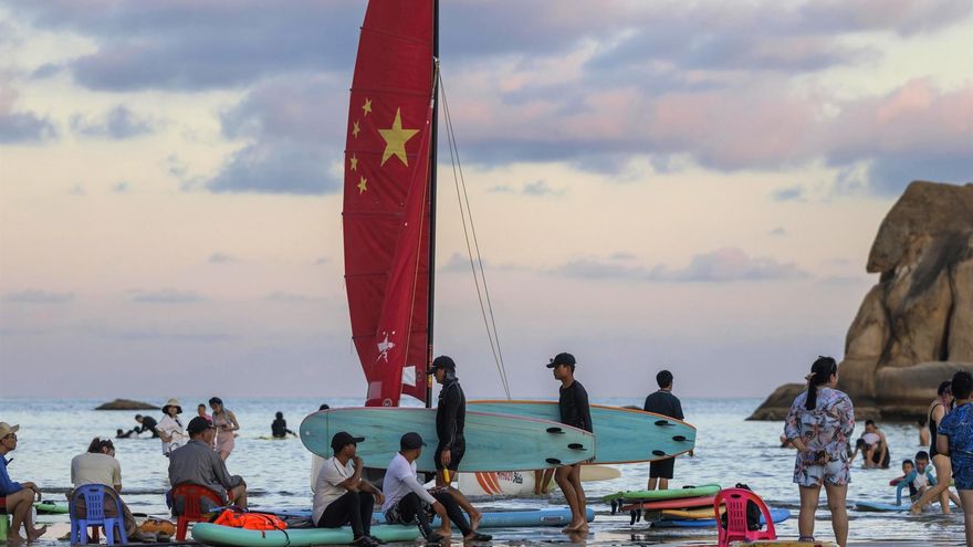 Para refrescarse, cientos de chinos se precipitaron el domingo a la playa de Xiamen, en la provincia de Fujian.