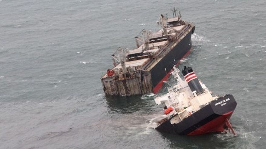 Imágenes aéreas muestran la popa del "Crimson Polaris" separada y hundiéndose mientras la otra parte del buque permanece a flote aunque levemente escorada.