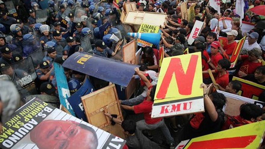 Algunos de los aproximadamente 4.000 manifestantes empezaron a empujar las barras de hierro y contenedores de metal que les impedían acercarse a la Cámara de Representantes en el suburbio de Quezon, donde el presidente Beningno Aquino III tenía previsto ofrecer un discurso más tarde el lunes, indicó la policía.