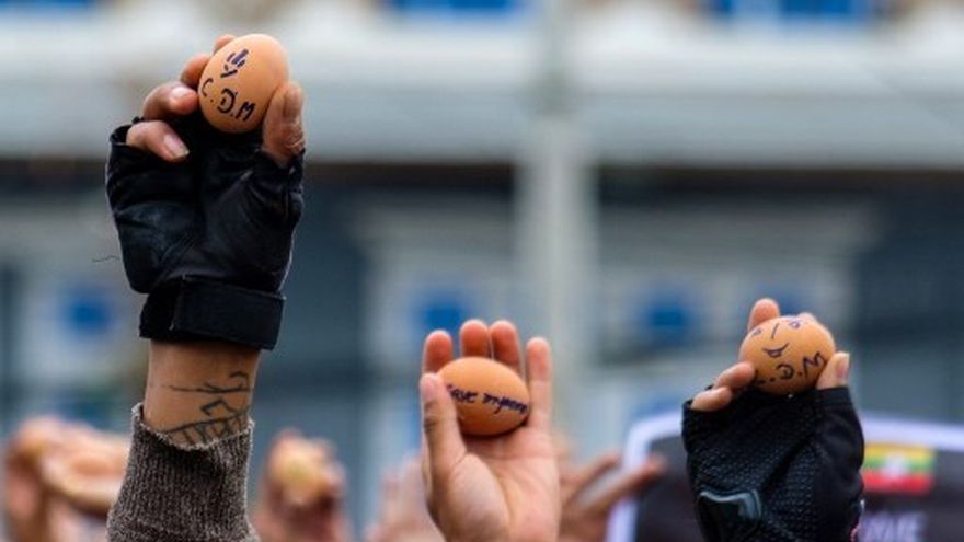 Coincidiendo con el Domingo de Pascua, el movimiento de desobediencia civil encontró una nueva forma de protesta con la publicación en las redes sociales de fotos de huevos decorados con mensajes contra el régimen como "Salvemos a Birmania", "Queremos democracia" o "Quítate de en medio MAH", en referencia al líder de la junta militar Min Aung Hlain.