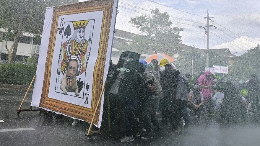 Desafiando la prohibición de reunirse más de cinco personas, los manifestantes apilaron falsos sacos mortuorios pintados de rojo a los pies del Monumento de la Democracia, en Bangkok, para después dirigirse a la sede del gobierno, donde fueron bloqueados por camiones de agua.