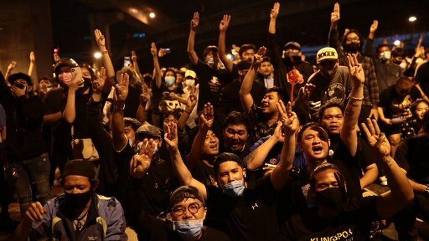 El miércoles, varias decenas de manifestantes hicieron el ya emblemático gesto de levantar tres dedos de la mano al paso del vehículo de la reina Suthida, lo que fue interpretado como un desafío a la autoridad real.