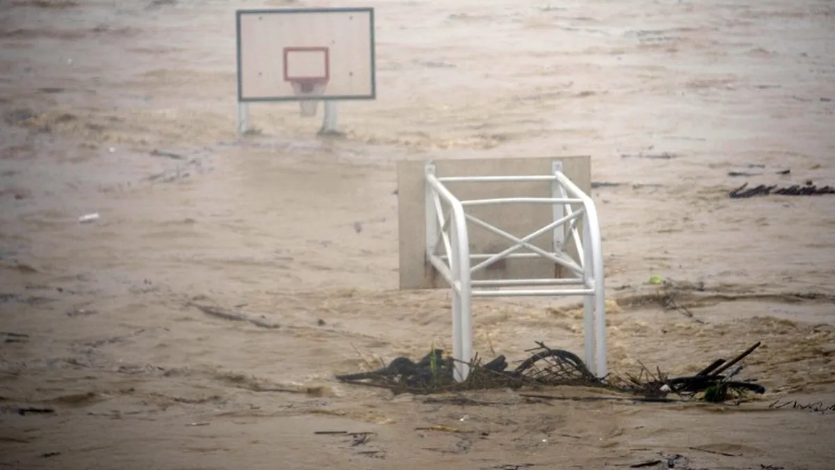 Un estadio está inundado por el río Jingmei debido al tifón Soudelor que golpea Taipei. / AFP