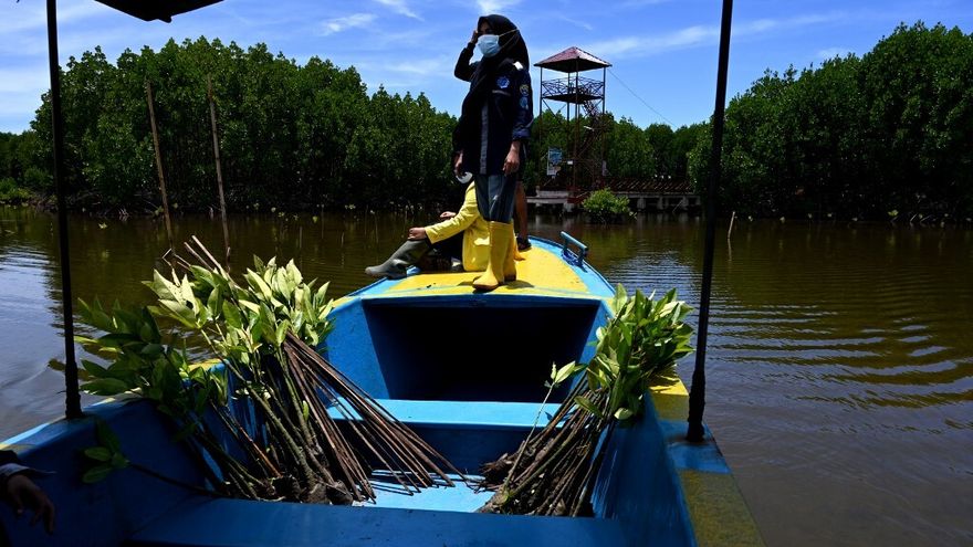 Con el barro hasta los tobillos, las mujeres caminan a lo largo de la ribera con las plantas de mangle en la cabeza para reforestar una parte descubierta del litoral. El proceso será largo y arduo.