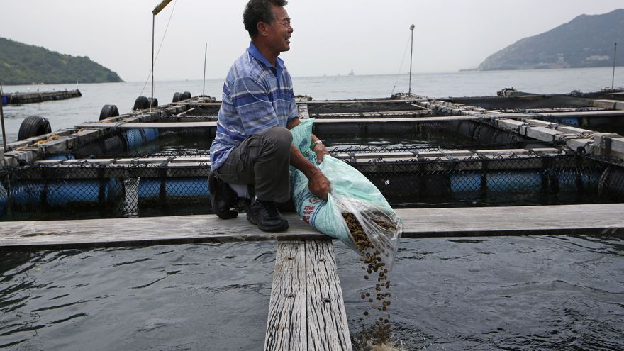 En las aguas que rodean una de las pequeñas islas del territorio, Lai Tak-chuen se sentaba en cuclillas sobre un muelle de madera en su criadero de peces. Allí vertía pienso para los saba o caballas de la piscifactoría.