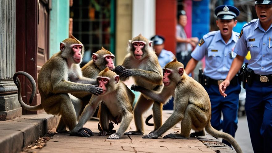 Los agentes de policía de una ciudad del centro de Tailandia tuvieron que atrincherarse en su propia comisaría durante el fin de semana ante una amenazadora turba de 200 monos fugitivos.