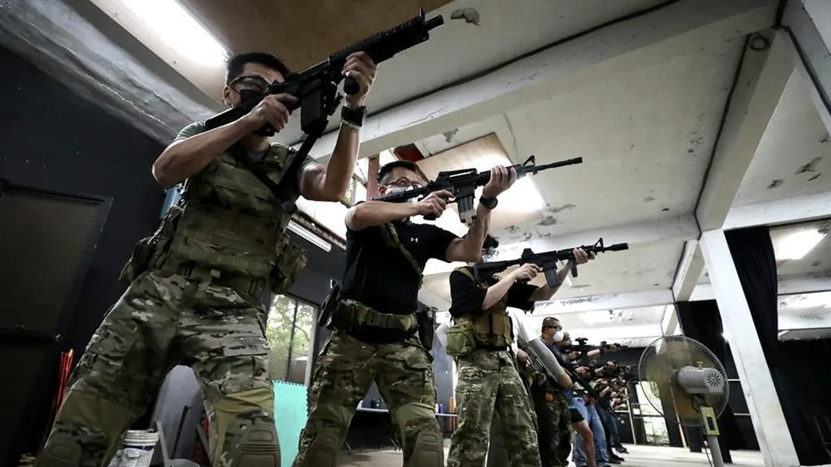 Durante un simulacro para rechazar el acceso del enemigo a la capital, Taipéi, los reservistas armados con ametralladoras atravesaron este lunes trincheras de arena excavadas debajo de un puente antes de pasar a la posición de fuego.