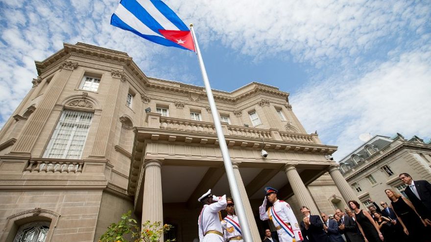 Tres militares marcharon por la puerta de la embajada e izaron el estandarte cubano -rojo, blanco y azul con una estrella solitaria- a las 10H36 (14H36 GMT), bajo los acordes del himno cubano.