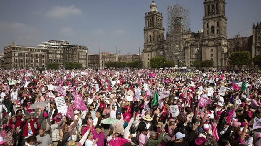 Vestidos de blanco y rosa, los detractores del presidente izquierdista Andrés Manuel López Obrador se concentraron en el Zócalo, plaza principal de Ciudad de México, en uno de cuyos costados se ubica el Palacio Nacional (sede del gobierno).