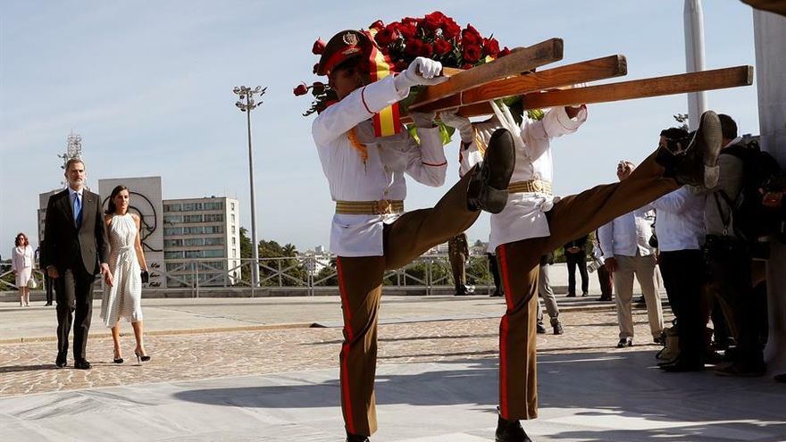 "Sus majestades los reyes, a José Martí", rezaba la corona de rosas rojas con la bandera española depositada ante la estatua del prócer cubano, en la Plaza de la Revolución, antes de la bienvenida de Díaz-Canel y su esposa, Lis Cuesta.
