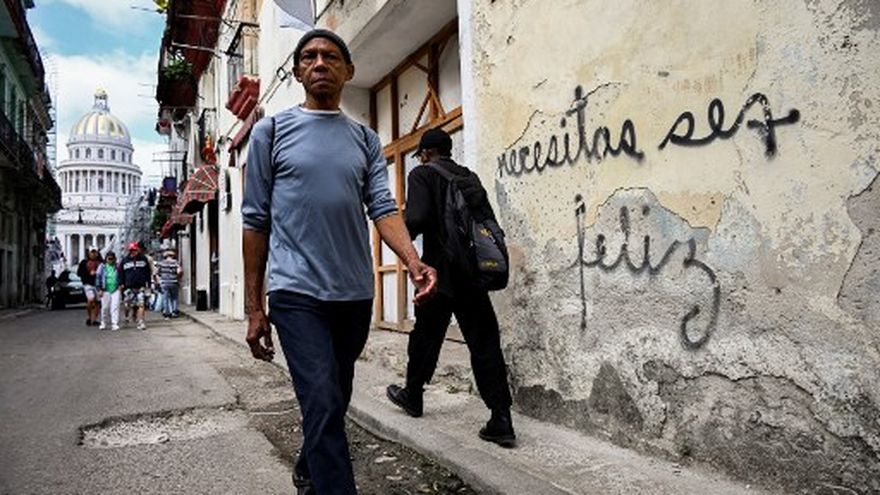 Hombre camina en las calles de Cuba que se han llenado con el mensaje 'necesitas ser feliz' / AFP