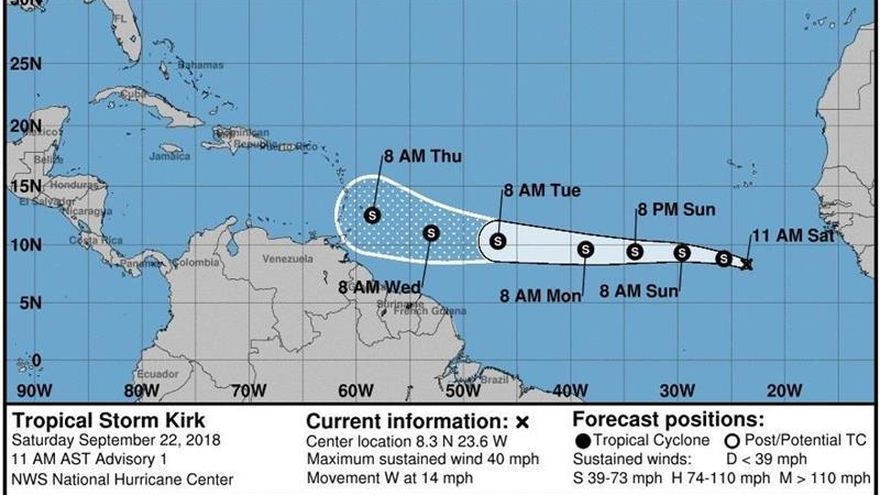 Imagen cedida el pasado 22 de septiembre de  por el Centro Nacional de Huracanes (NHC), que mostró el pronóstico de tres días de la tormenta tropical Kirk, durante su avance hacia el oeste en el Atlántico desde las costas de África. / EFE
