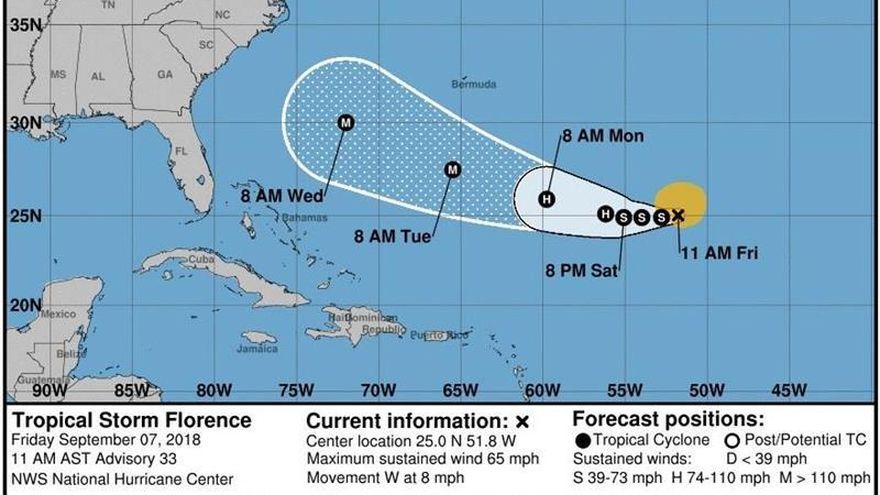 Los expertos vaticinan que Florence, aún lejos de zonas pobladas, mantendrá esta trayectoria hasta el domingo, para la semana próxima girar hacia el oeste-noroeste.