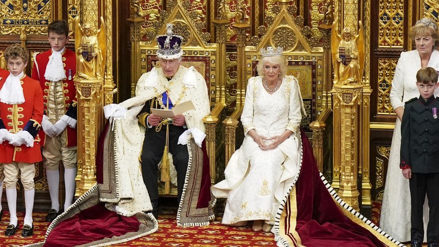 Con la corona imperial sobre su cabeza e instalado en el trono de oro de la Cámara de los Lores, junto a la reina Camila, sentada a su izquierda, el rey pronunció el discurso de diez minutos.