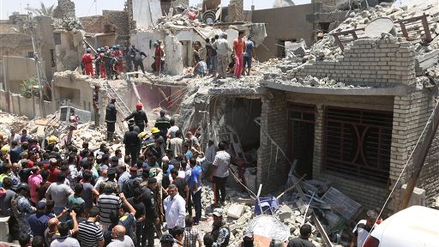 Equipos de rescate iraquíes buscan sobrevivientes luego que un caza de fabricación rusa dejó caer por accidente una bomba sobre el barrio de Nuevo Bagdad, Irak, el lunes 6 de julio de 2015. / AP