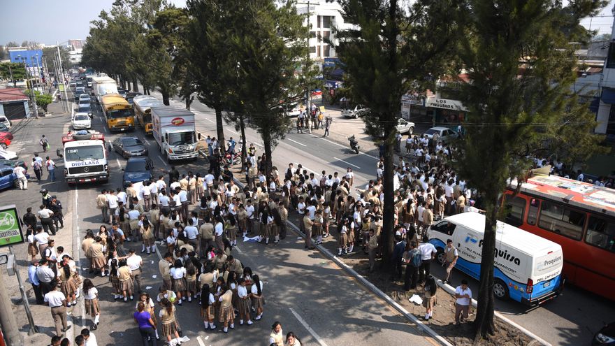 Según las imágenes difundidas por los medios locales, un grupo de estudiantes cortó el tráfico y varios conductores molestos intentaban buscar rutas alternativas mientras agentes de la Policía Nacional Civil (PNC) acudían al lugar.