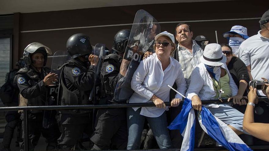 Entre los disturbios, los antimotines de la Policía Nacional lanzaron bombas "aturdidoras" para dispersar a los "blanquiazules", quienes, sin rendirse, continuaron clamando a voces por una "Nicaragua libre".