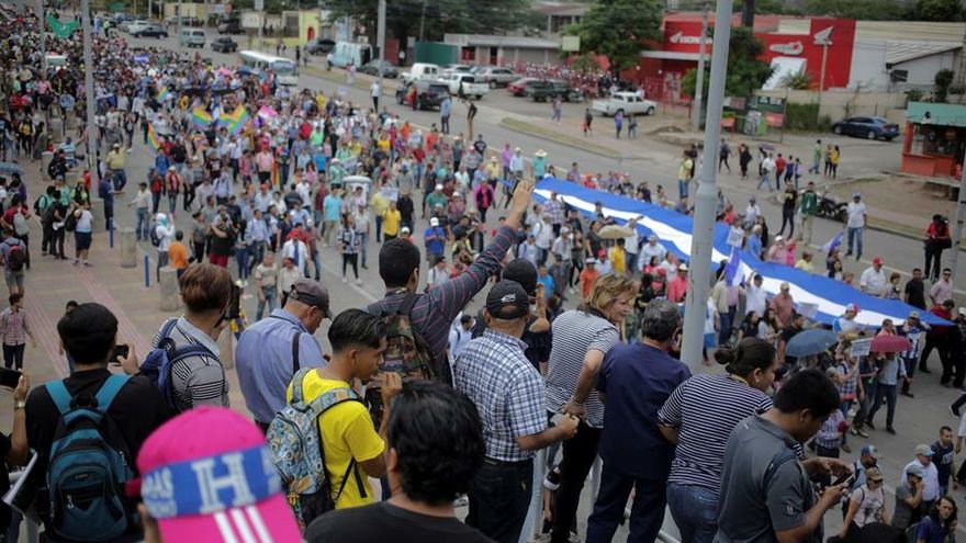 Con banderas con el azul y blanco del país, y en rojo y negro del partido Libertad y Refundación (Libre), y carteles con la frase "Fuera JOH" (Juan Orlando Hernández), los manifestantes marcharon de forma pacífica por un bulevar de Tegucigalpa hasta inmediaciones de la Casa Presidencial, que permanece resguardada por policías.