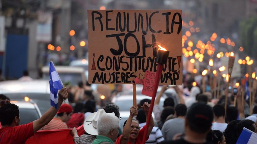 Una multitud con antorchas bajo una llovizna intermitente exigió la noche de este viernes, 5 de junio, en Honduras la renuncia del presidente, Juan Orlando Hernández, acusado de corrupción por el desvío de fondos del Seguro Social a su campaña en 2013.