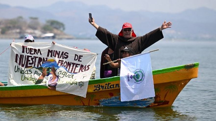 Este viernes, diez pequeñas embarcaciones de motor, cada una con una quincena de activistas a bordo, surcaron las tranquilas aguas del Güija con pancartas y banderas de El Salvador y Guatemala, al coro de consignas de rechazo como "¡Alto a la minería!".