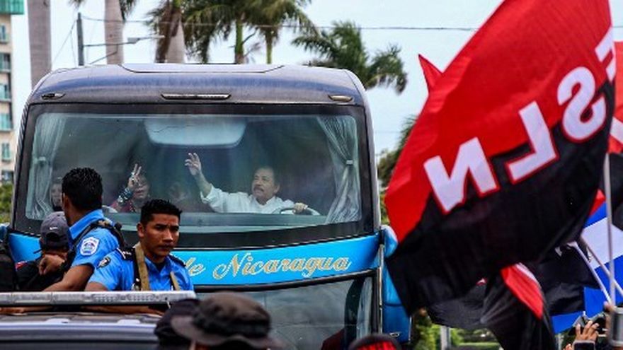 La pareja presidencial se dirigió a Masaya, 30 km al sur de la capital, custodiada por las fuerzas de policía y a bordo de un autobús de dos pisos, desde cuya planta alta saludaron a los sandinistas que acompañaron la caravana, en la que sobresalían las banderas del Frente Sandinista (FSN, izquierda).