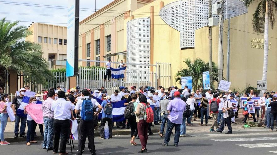 "No a la censura de la dictadura", "No me callarán", "Quítate el bozal, vos sos libre de expresarte", se leía en pancartas, mantas y camisetas llevadas por decenas de manifestantes ante la Asamblea Nacional.