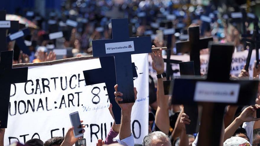 En la protesta de este domingo, a la que acudieron en su mayoría simpatizantes del partido Nuevas Ideas el cual ayudó a formar el presidente Bukele, los participantes dejaron pegados en un portón de acceso al Congreso cruces negras como señal que en las elecciones legislativas de febrero de 2021 "los diputados que no apoyan al pueblo no serán reelectos".