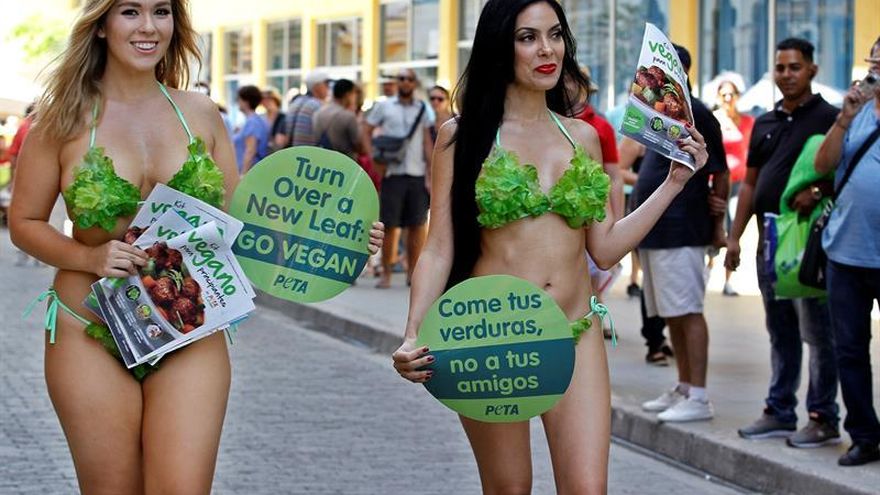 "Somos las primeras damas lechugas de Peta en llegar a Cuba y estamos aquí para pedir que extiendan su compasión a los animales y no los coman", explicó Kiara Bennac, mientras sostenía un cartel donde se leía "Turn over a new leaf: Go vegan" un juego de palabras que puede traducirse como "Da la vuelta a la hoja: Hazte vegano".