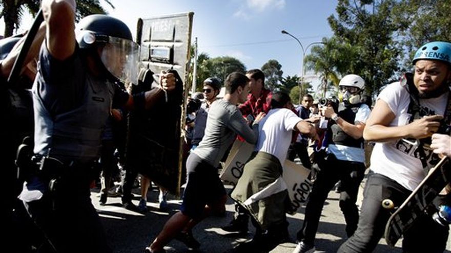 Más de 300 manifestantes se congregaron en la avenida principal que conduce al estadio Itaquerao, en el este de Sao Paulo. Algunos intentaron bloquear el tránsito, pero la policía respondió con gases lacrimógenos y bombas de ruido.