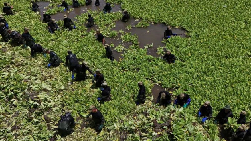 Con trajes impermeables que cubren la mitad de su cuerpo, los soldados van pacientemente sacando las plantas invasoras, apoyados con tres barcazas, y los pescadores cargan las plantas en cestos en medio de un olor nauseabundo.