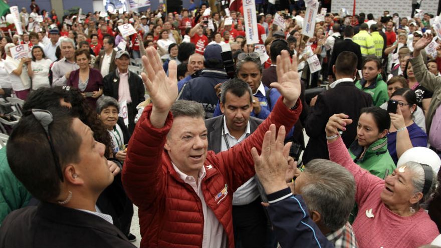 Según las encuestas, Santos y el opositor Oscar Iván Zuluaga figuran como favoritos, pero a ninguno le alcanzaría para triunfar en primera vuelta con el 51% de los votos. Ello obligaría a ambos a medirse en una segunda contienda el 15 de junio.
