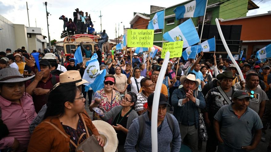 Ondeando banderas nacionales, azul y blanco, los manifestantes corean consignan y llevan carteles en los que piden la renuncia de la fiscal general Consuelo Porras; del jefe de la fiscalía contra la impunidad, Rafael Curruchiche; y del juez Fredy Orellana, a quienes acusan de una ofensiva contra el presidente electo.
