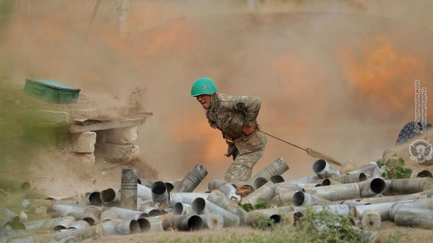 A los combates en el terreno, con el empleo de aviones, drones, artillería pesada, lanzaderas de cohetes y carros blindados, se suma la guerra informativa entre Bakú y Ereván.