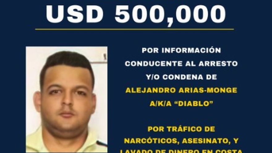 Estados Unidos/El Departamento de Estado de Estados Unidos, a través de su Oficina de Asuntos Antinarcóticos y Aplicación de la Ley Internacional, anunció hoy una recompensa de hasta 500 mil dólares por información que conduzca al arresto y/o condena de Alejandro Arias-Monge, alias Diablo, considerado el fugitivo más buscado en Costa Rica.