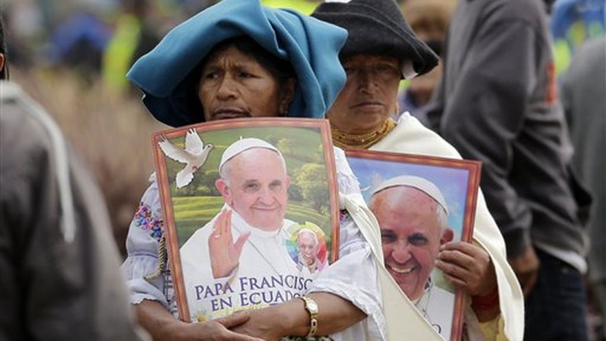 Indígenas otavaleños sostienen posters con la imagen del papa Francisco a su llegada al parque Bicentenario de Quito, Ecuador, donde el pontífice ofició una misa multitudinaria el 7 de julio de 2015. Una de las lecturas de la misa fue hecha en quichua, la lengua indígena dominante en la nación andina. / AP
