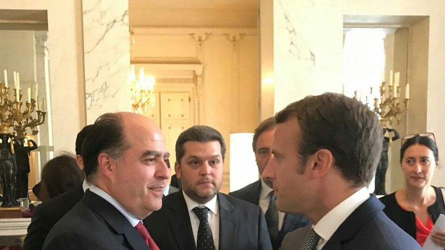 Borges indicó a la salida de su cita en el Elíseo que el mandatario les expresó "el apoyo total a la Asamblea Nacional" que ambos representan, "que se reconoce como legítima, obtenida con los votos democráticos del pueblo venezolano y que tiene que ser el punto de encuentro y de construcción de una solución democrática".