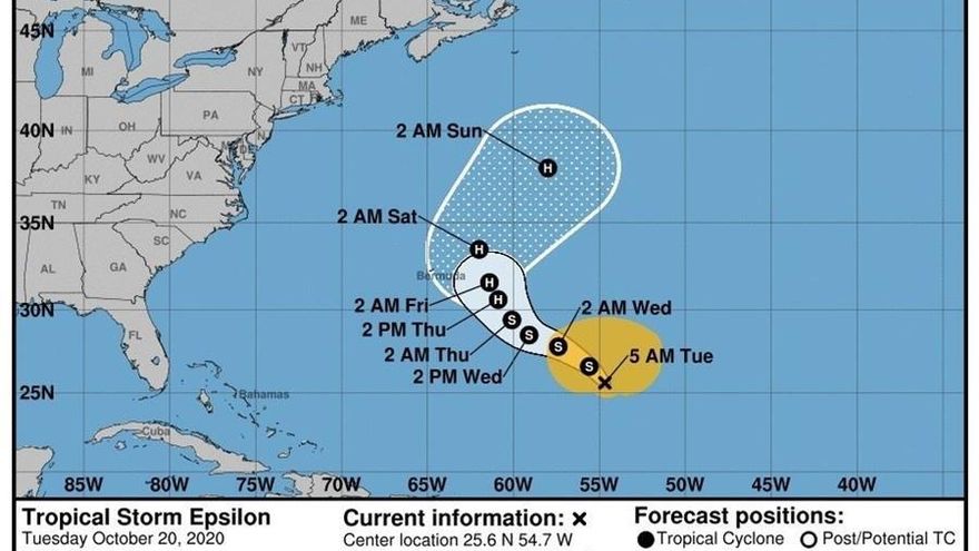 La tormenta tropical Epsilon avanza sobre el Atlántico con vientos máximos sostenidos de 45 millas por hora (75 km/h) en dirección este-noreste y se espera que el jueves esté cerca de las islas Bermudas como huracán.