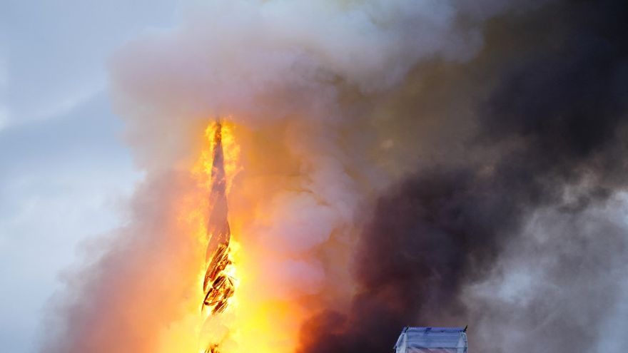 Copenhague, Dinamarca/Un gran incendio se declaró este martes en el edificio de la antigua Bolsa de Copenhague, del siglo XVII, y su emblemática flecha se derrumbó entre las llamas, constató una periodista de la AFP.