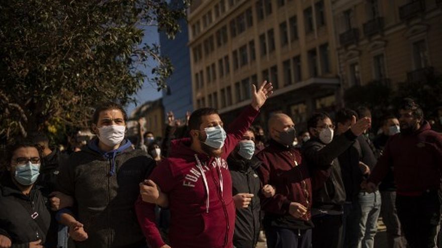 A pesar del confinamiento en vigor para impedir la propagación de la covid-19, alrededor de 400 estudiantes participaron en la protesta ante el edificio central de la Universidad de Atenas, todos con mascarillas y respetando el distanciamiento físico.