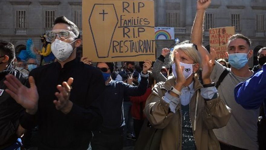 "¡Nos vamos a morir de hambre!" Cientos de manifestantes protestaron este viernes contra el cierre de bares y restaurantes en Cataluña, ordenado por 15 días por las autoridades para frenar el avance de la epidemia en esta región española.