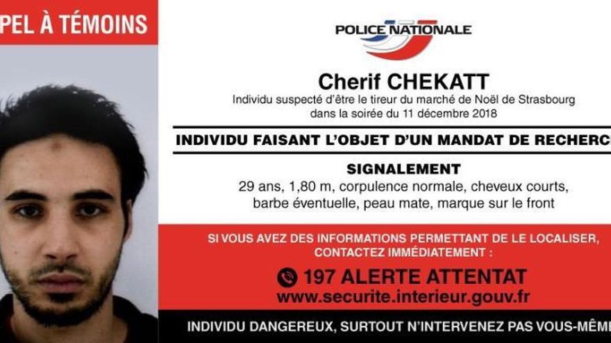 La búsqueda en Francia de Chérif Chekatt, que este martes mató a dos personas en Estrasburgo y dejó a otra en muerte cerebral en un atentado terrorista, ha movilizado hoy a más de 700 agentes de las fuerzas del orden, con un control reforzado en esa ciudad y en las fronteras.