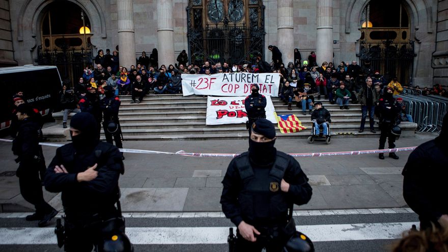 Los manifestantes desplegaron pancartas con lemas en catalán como "Es la hora del pueblo" o "23-F. Paremos el golpe de estado", en referencia al intento de golpe de Estado que tuvo lugar en España hace hoy 37 años.